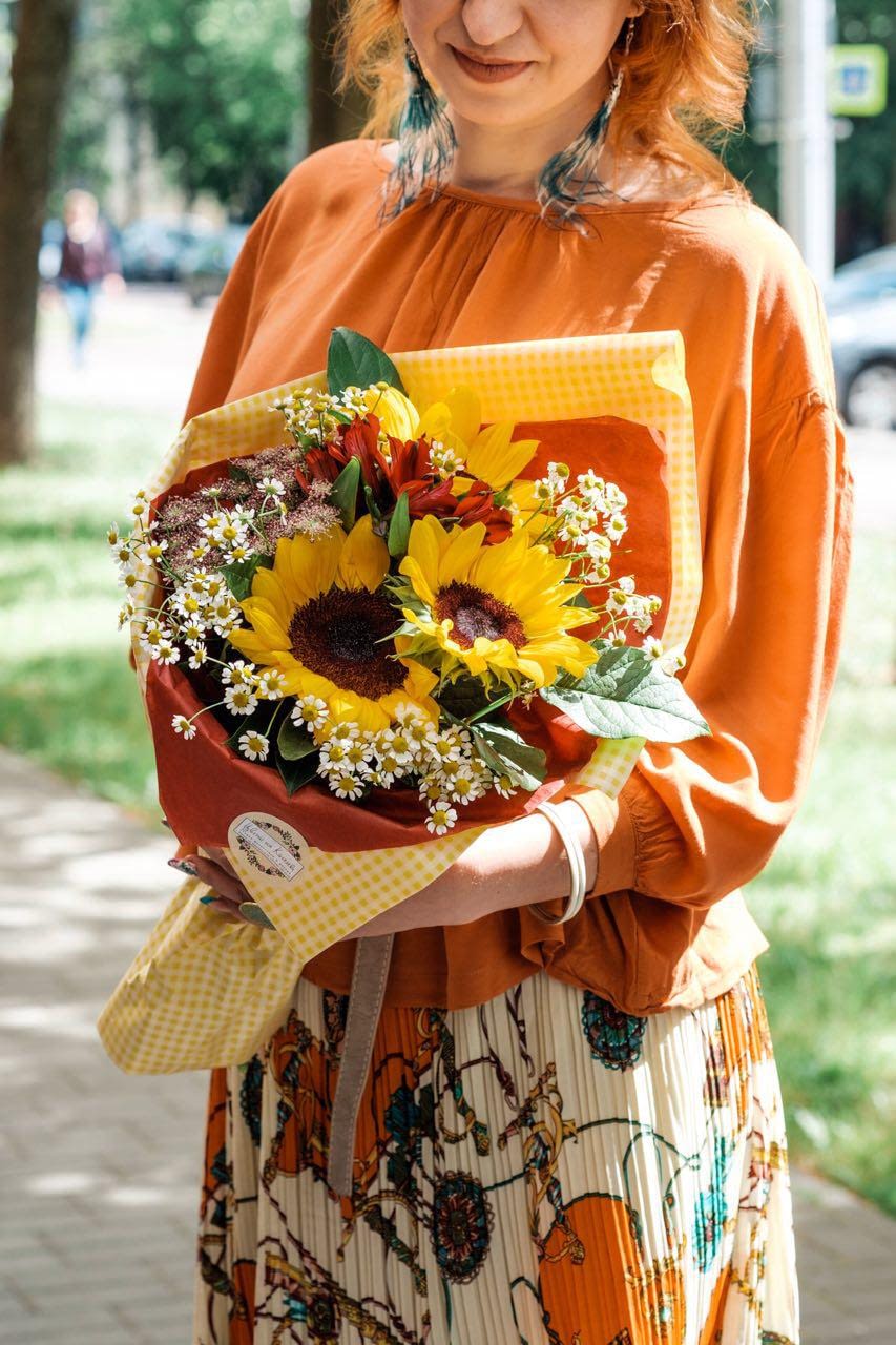 Состав: гелиантус, матрикария, амми, альстромерия, салал, упаковка.
