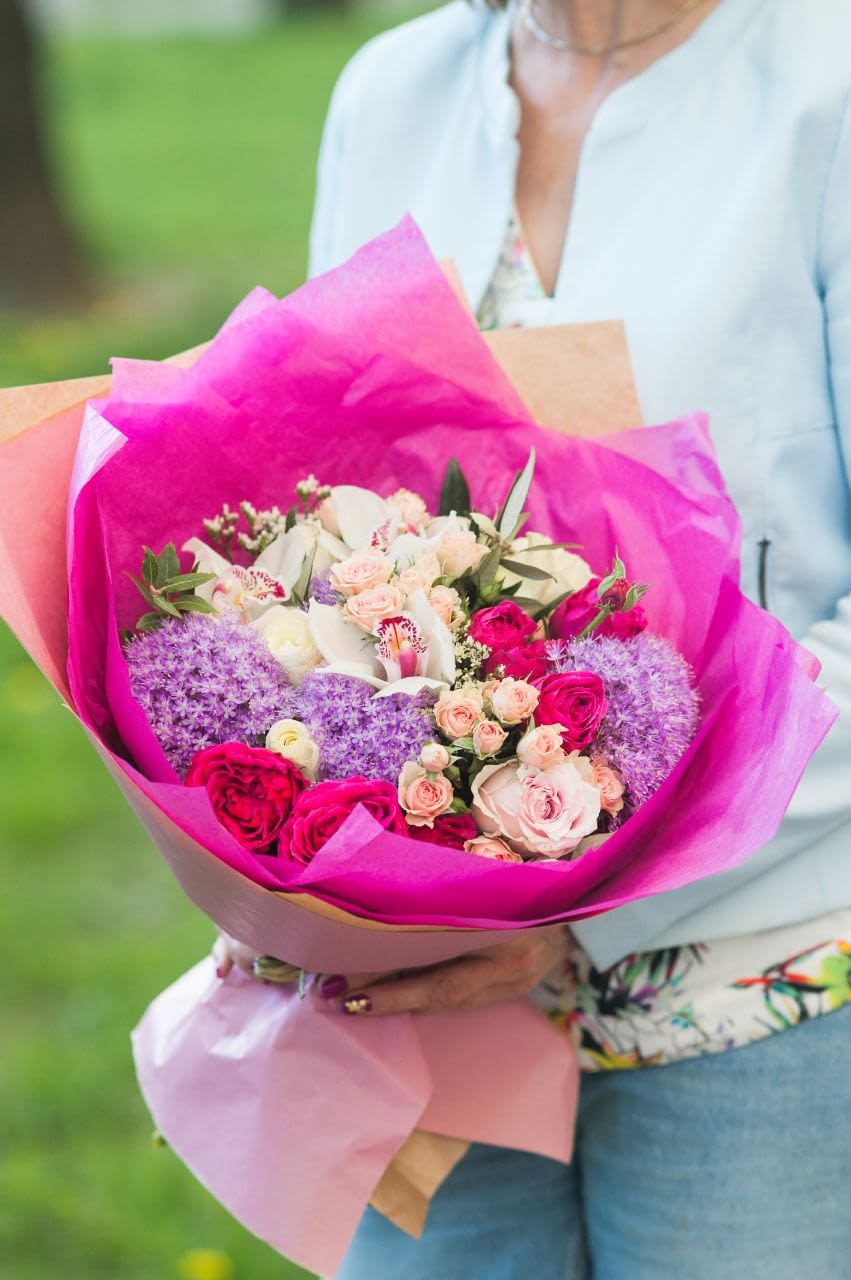 В составе: аллиум, цимбидиум, пионовидная роза, кустовая роза, зелень, упаковка.